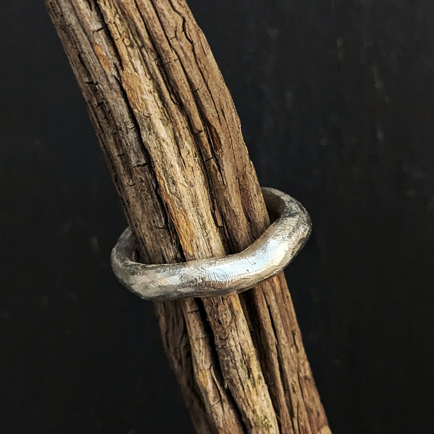 Organisk, let bølget håndformet sølvring med rustik overflade.