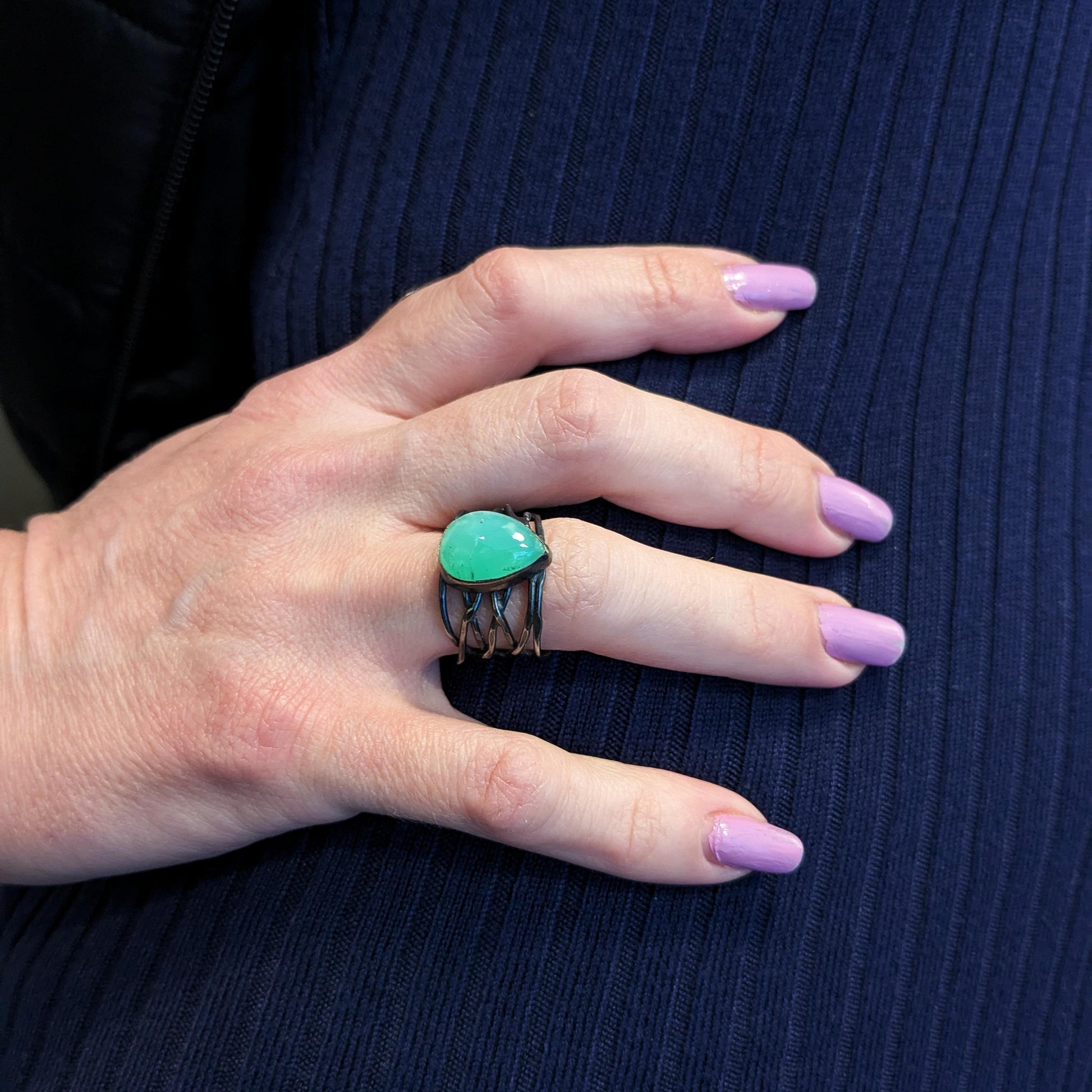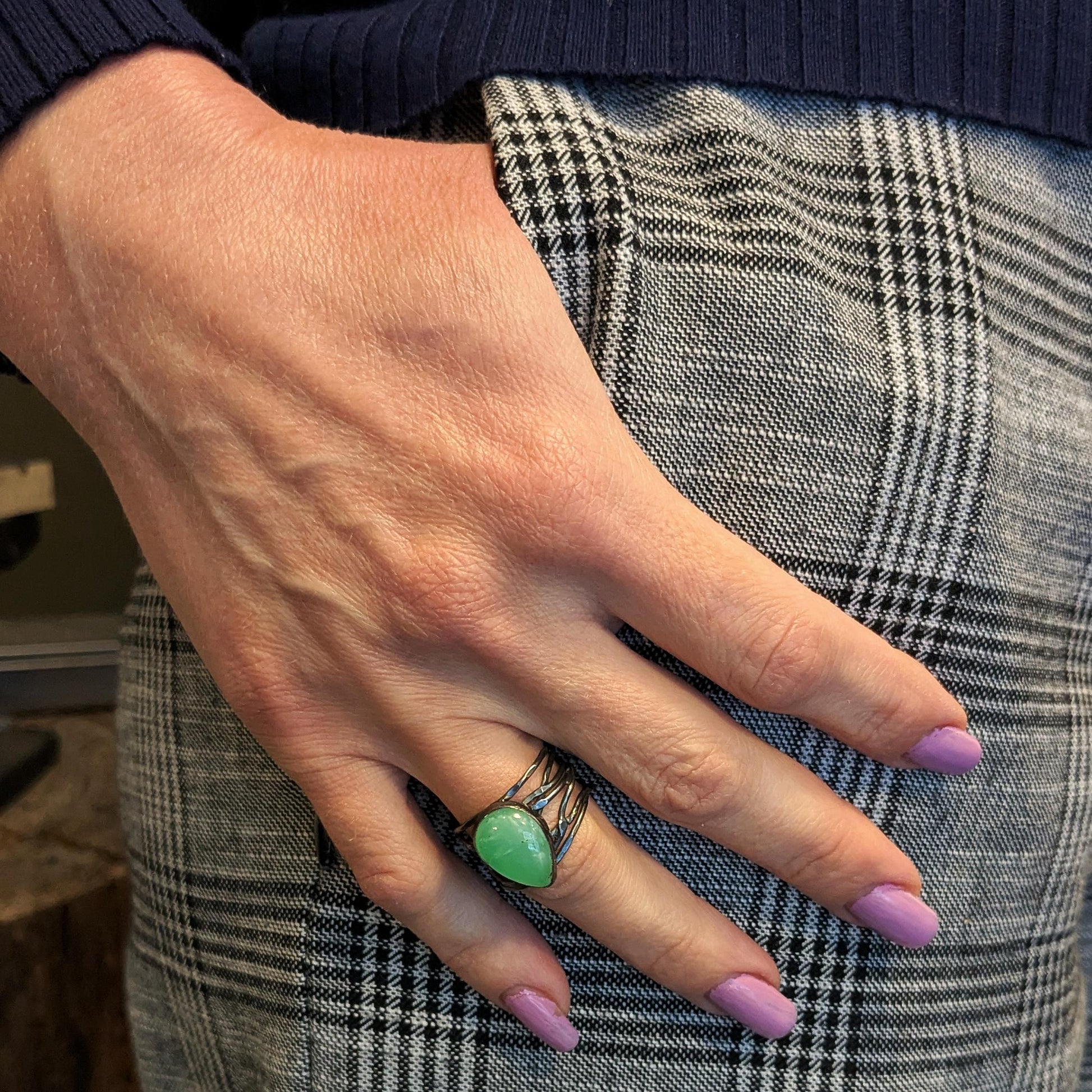 i sølv fatning på vævet sølvring.