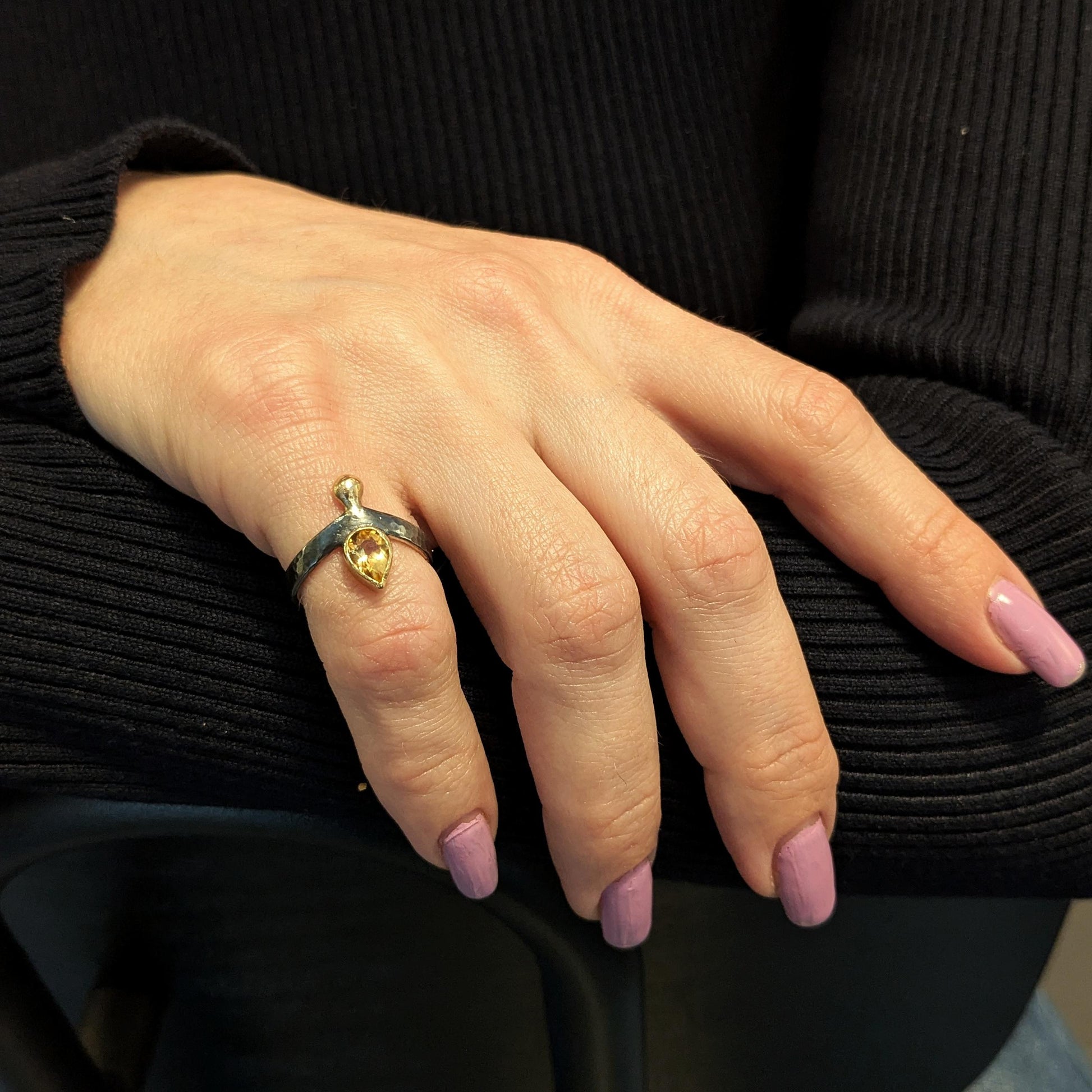 Elegant ring i sterling sølv med en smuk hammerslået overflade. I V’et, en gylden citrin-dråbe i guldfatning, og på spidsen pryder en lille gulddråbe, der fuldender det fine udtryk.
