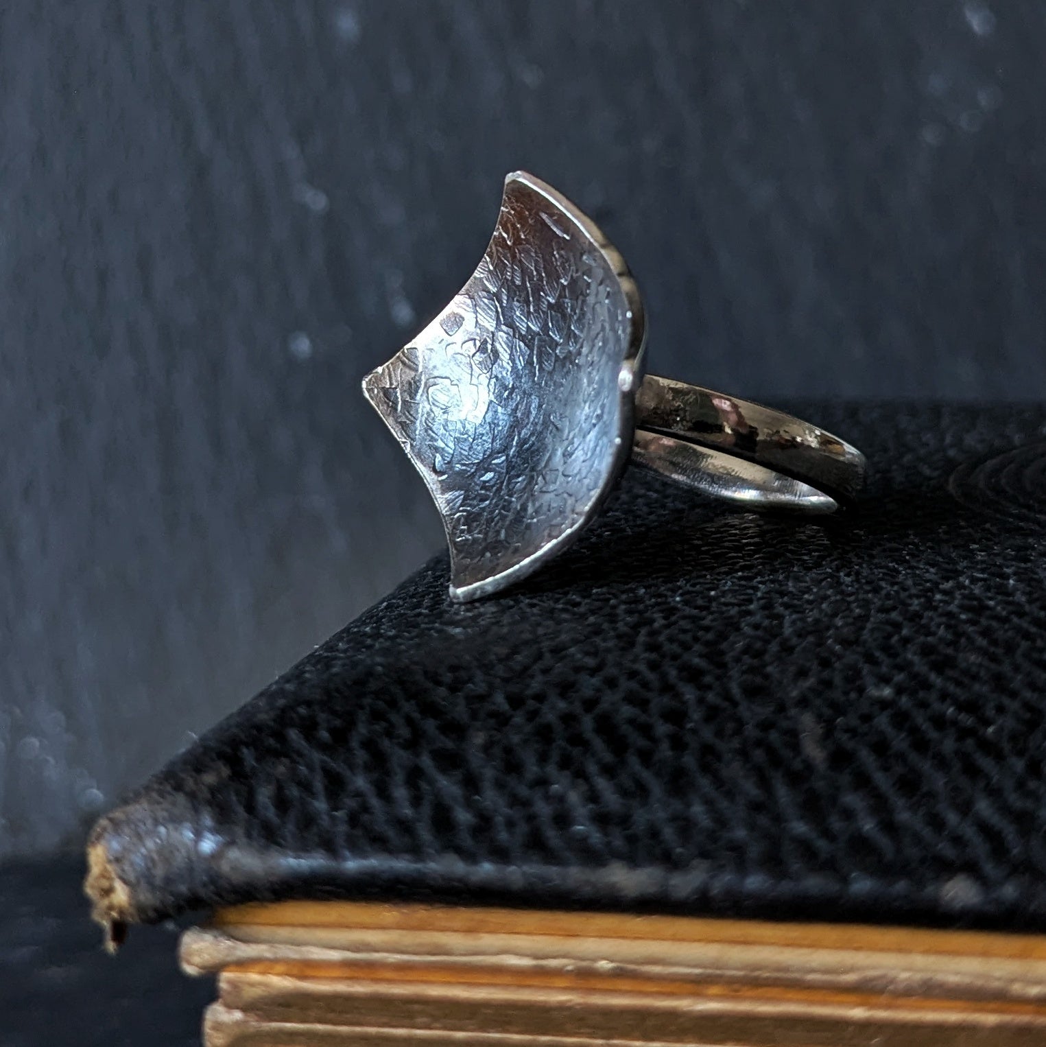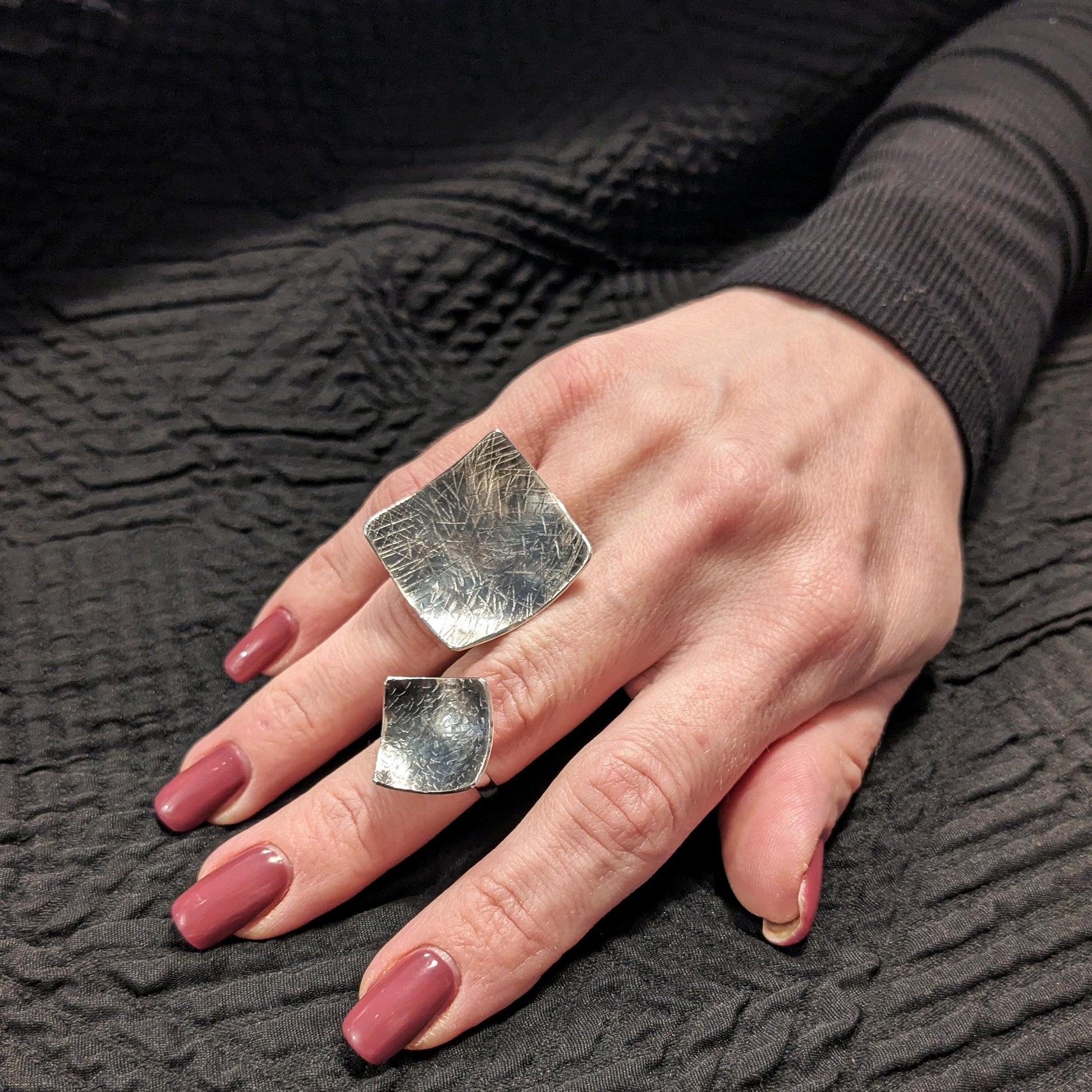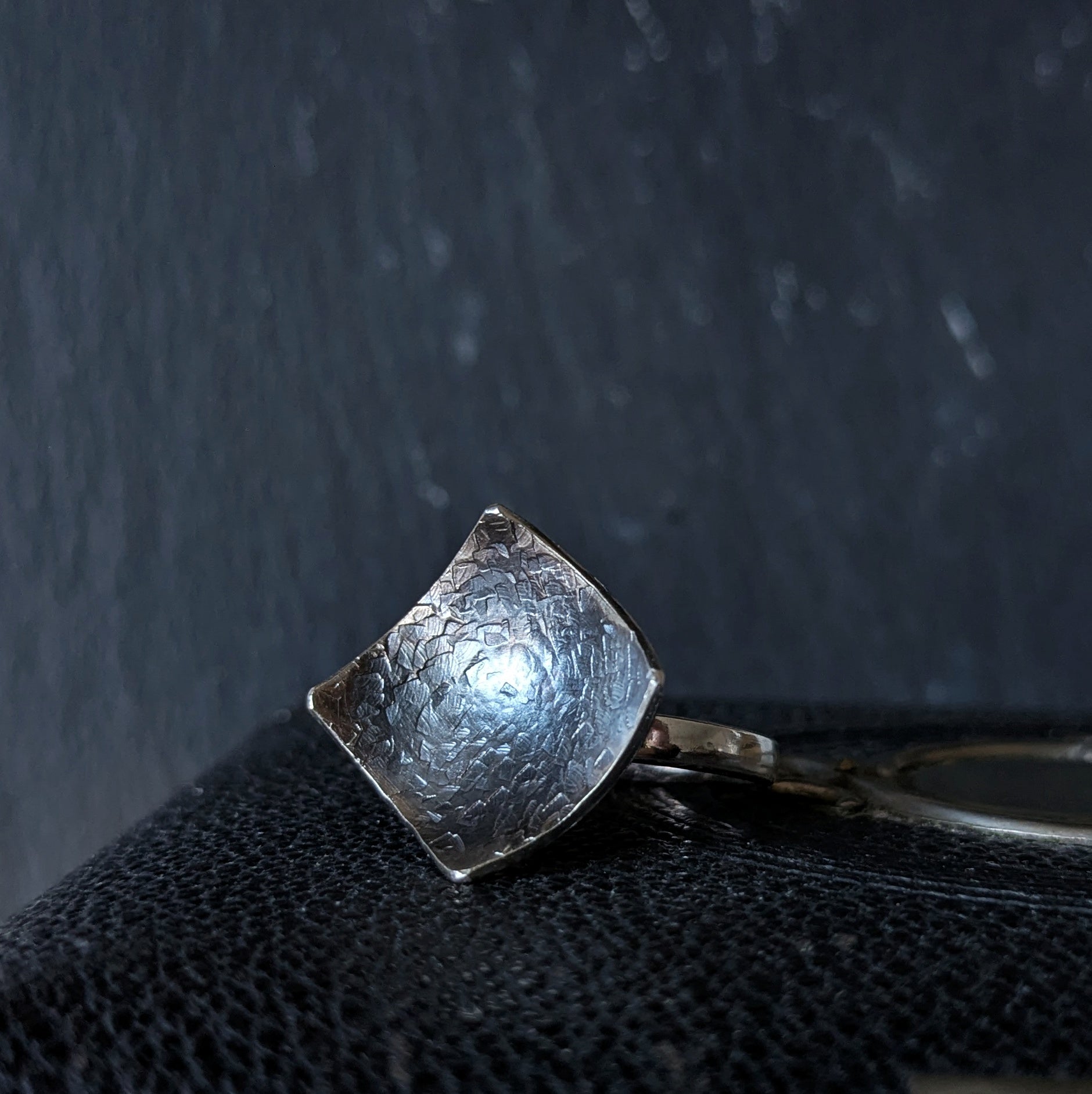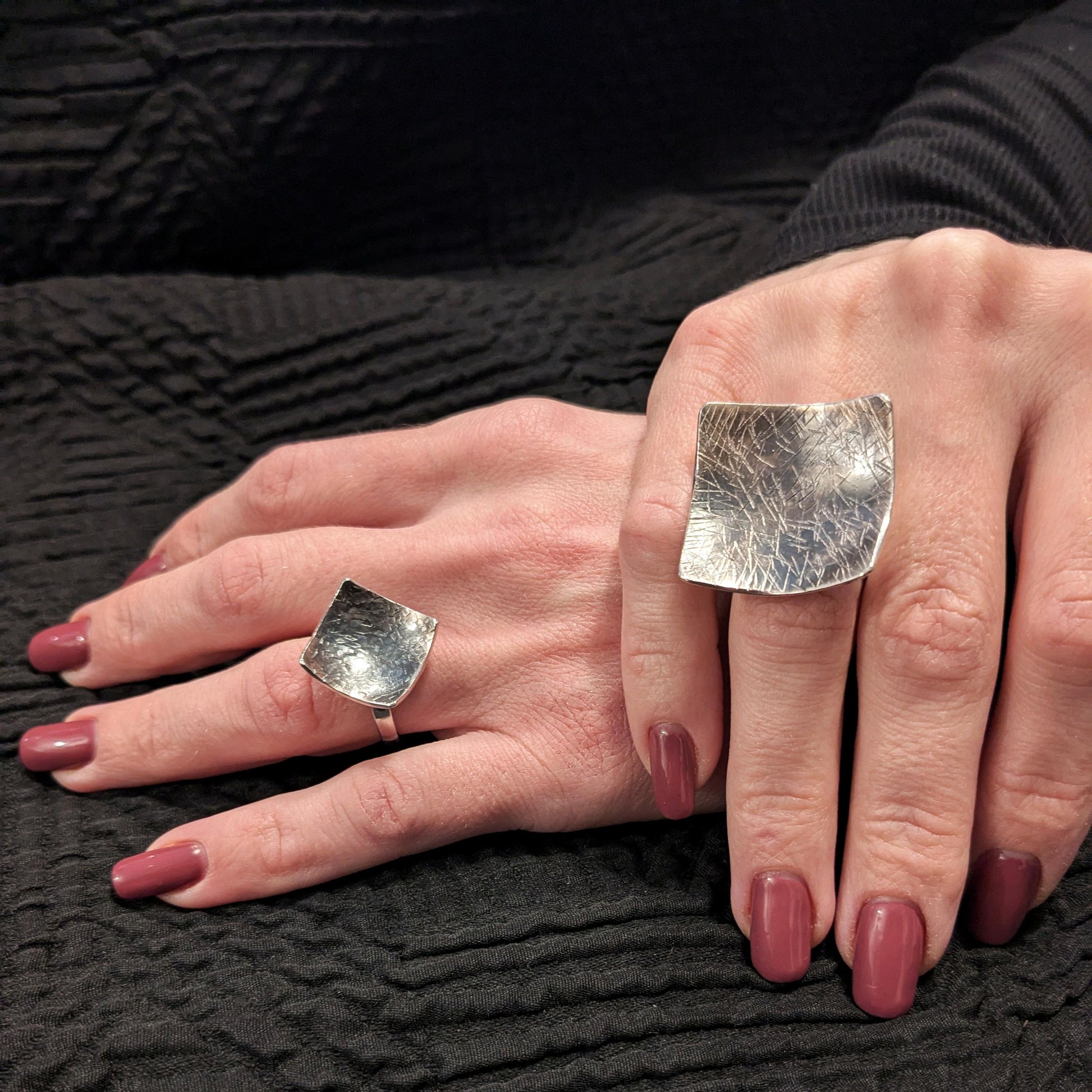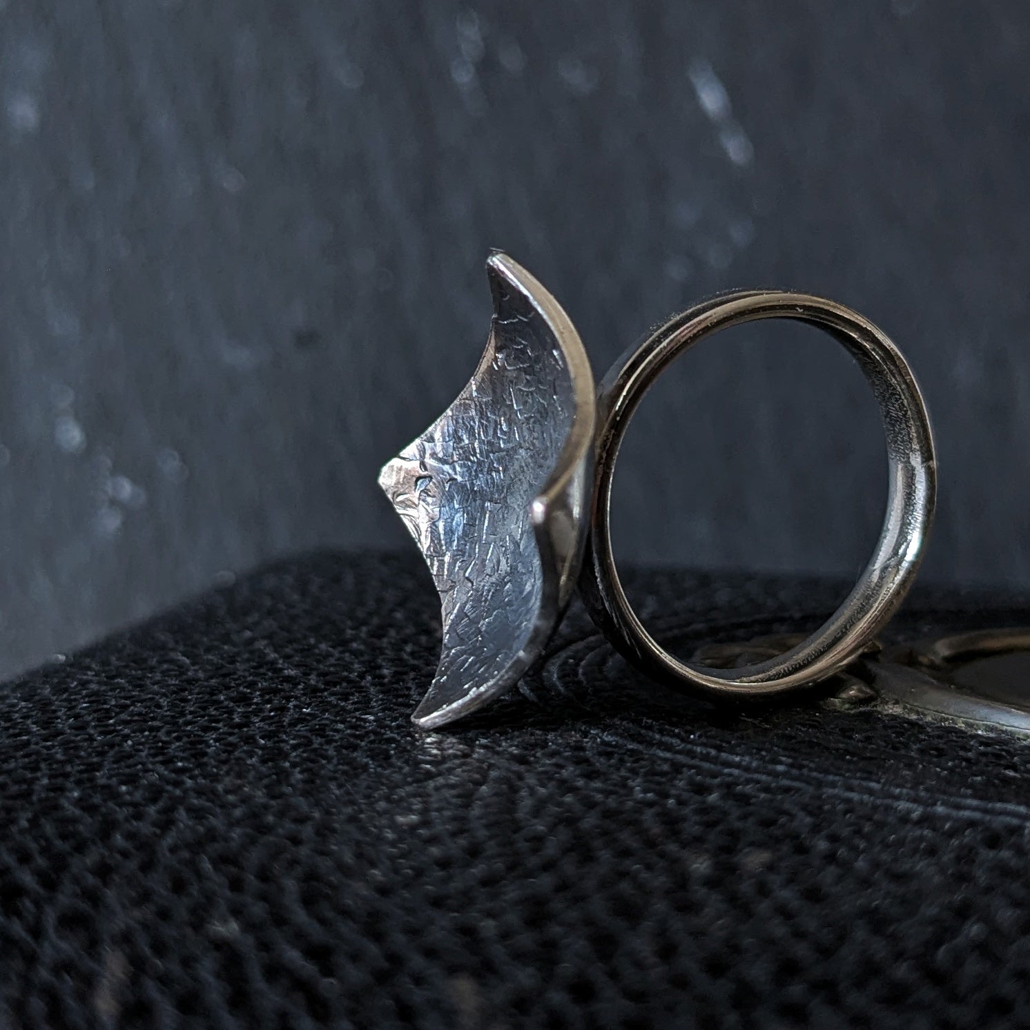 Echo er en mindre sølvring med samme bølgede form og rå overflade som sin storesøster Siluet. Den fanger lyset med sin buede flade og er skabt som en fin refleks – et ekko af noget større.