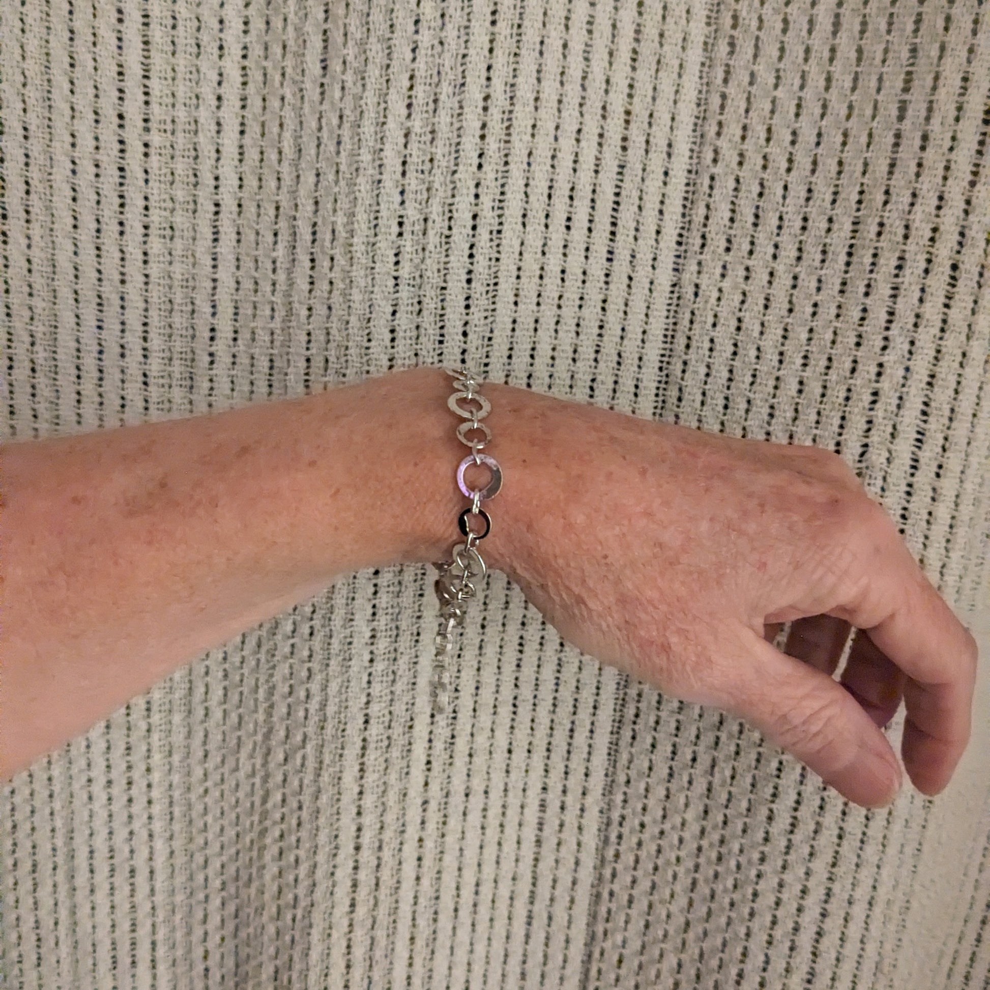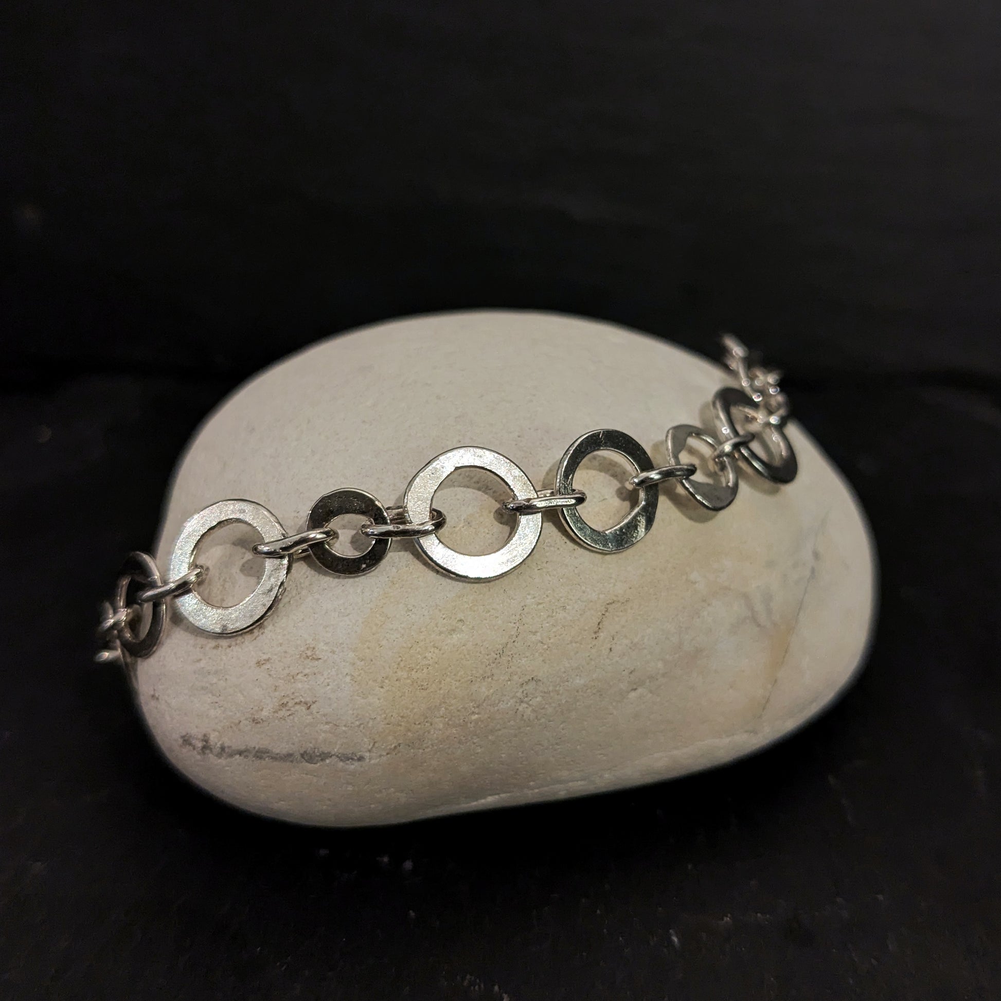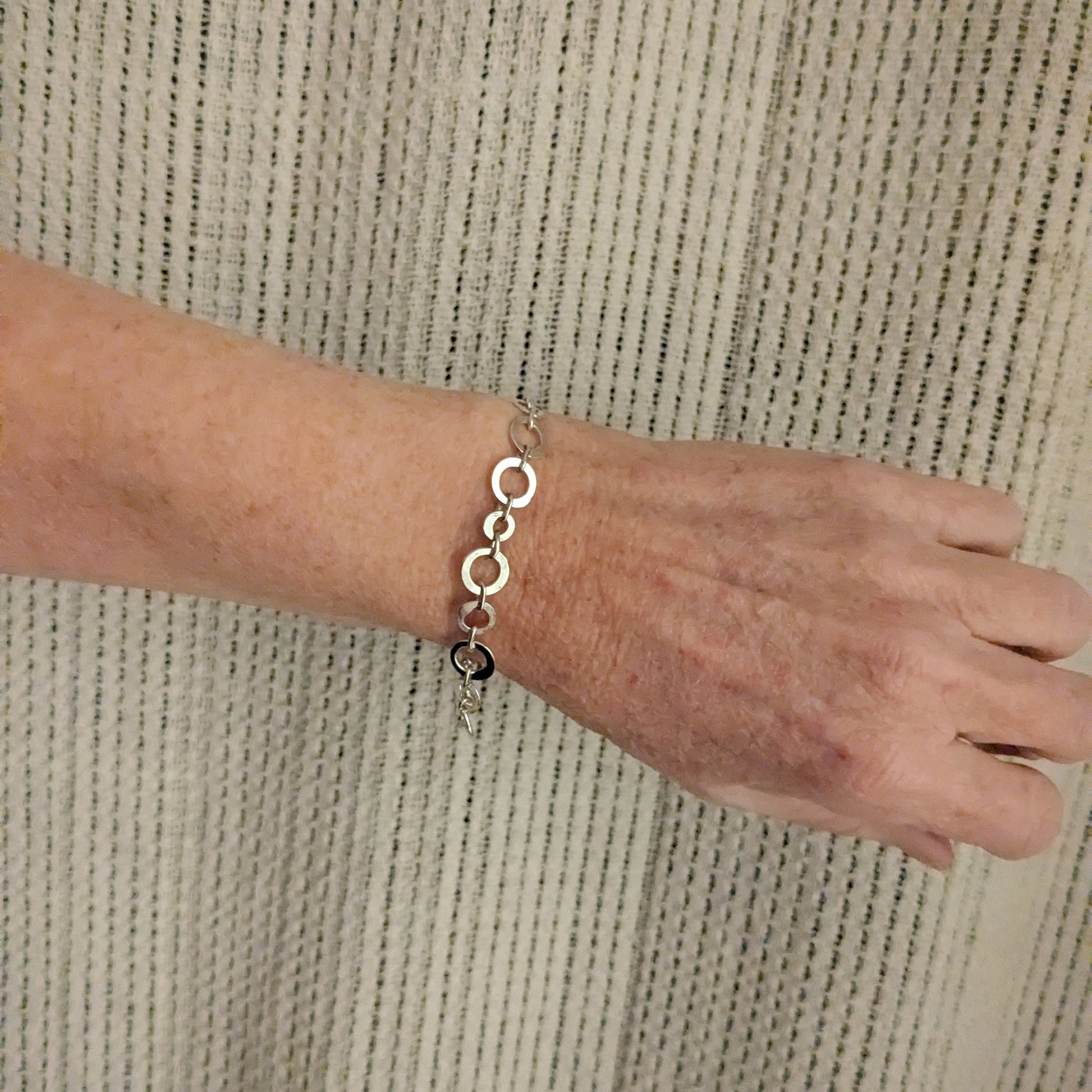 Flade, runde led i forskellige størrelser, ligger side om side og giver armbåndet et levende udtryk. DeT lægger sig roligt og afslappet om håndleddet.