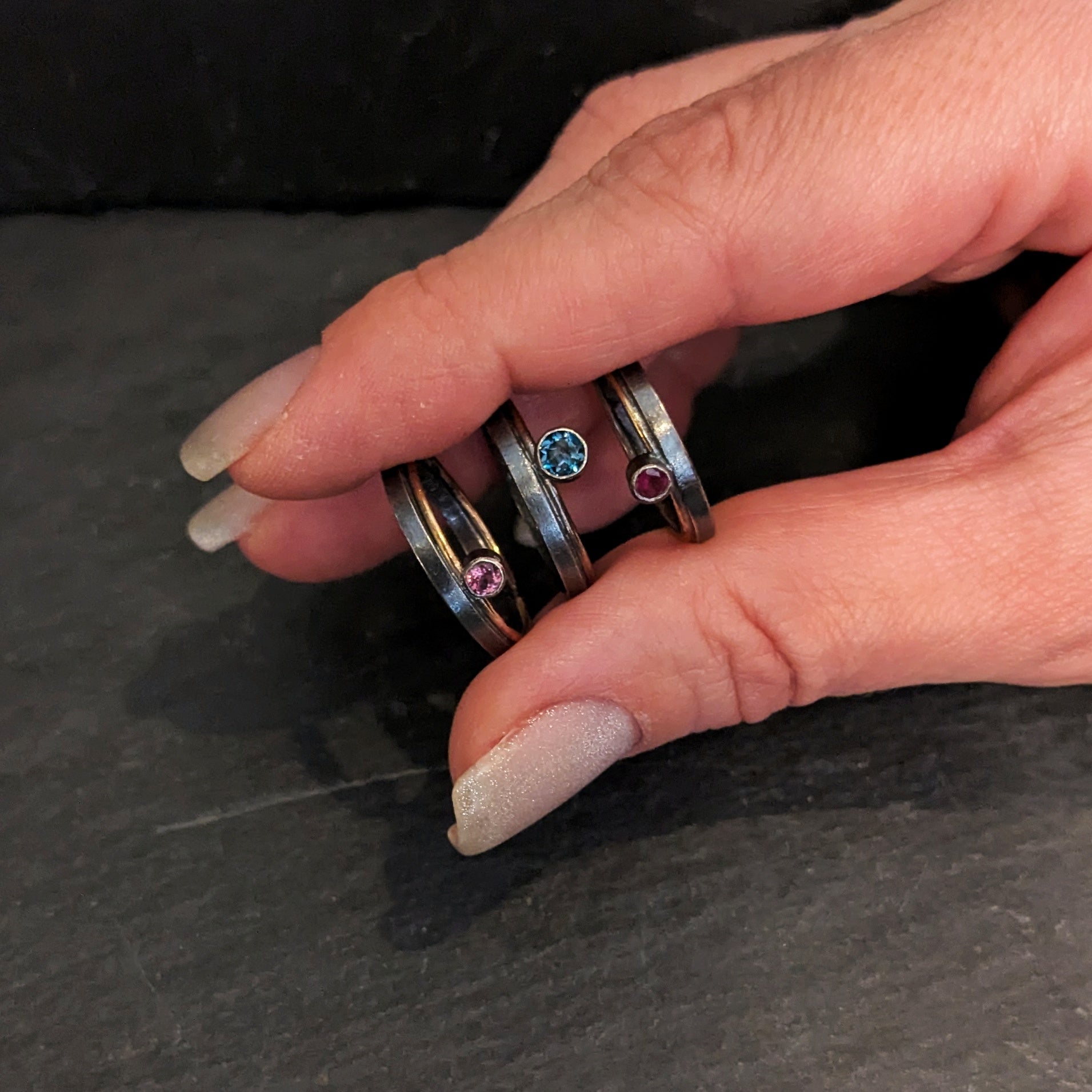 Fin og enkel ring i kantet oxyderet sterlingsølv, detaljeret med en tynd 9 kt. guldtråd og en smuk rhodolite-granat placeret langs den éne kant for et let asymmetrisk og karakterfuldt udtryk.