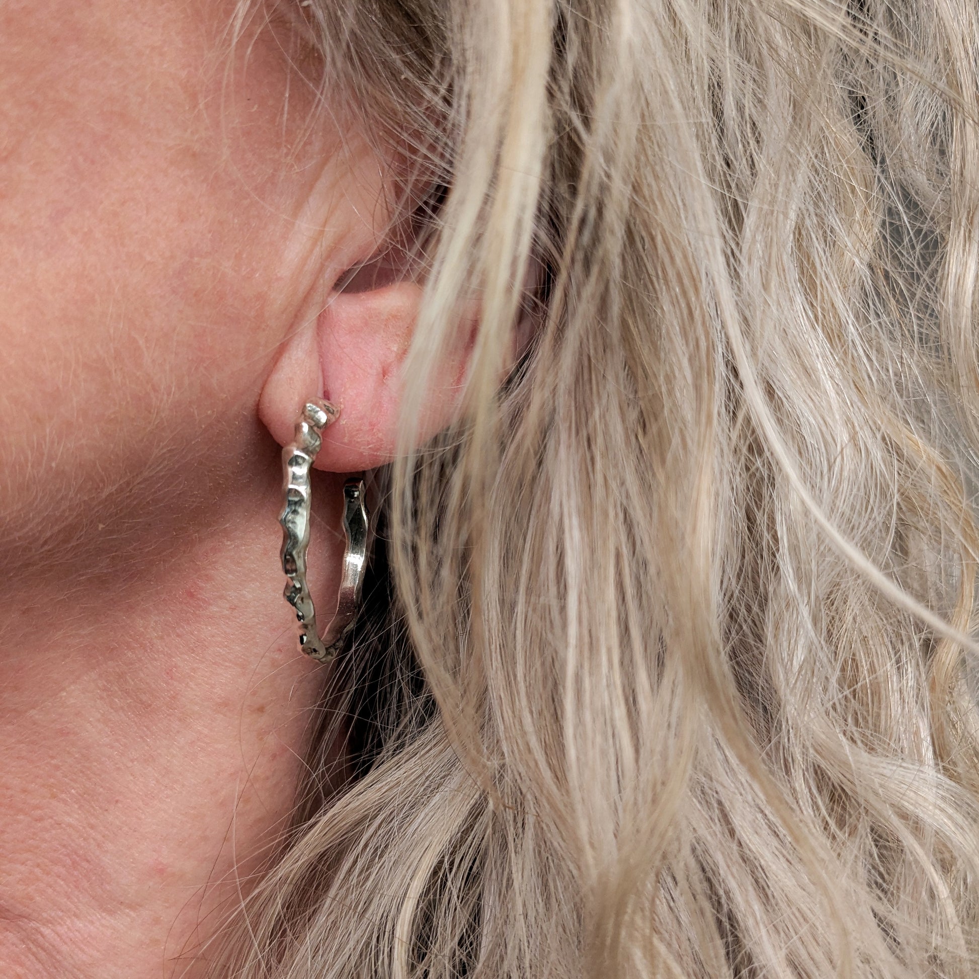 Hoops i sterlingsølv med lækker organisk struktur, der giver et råt og levende udtryk. Perfekte til både hverdag og fest.