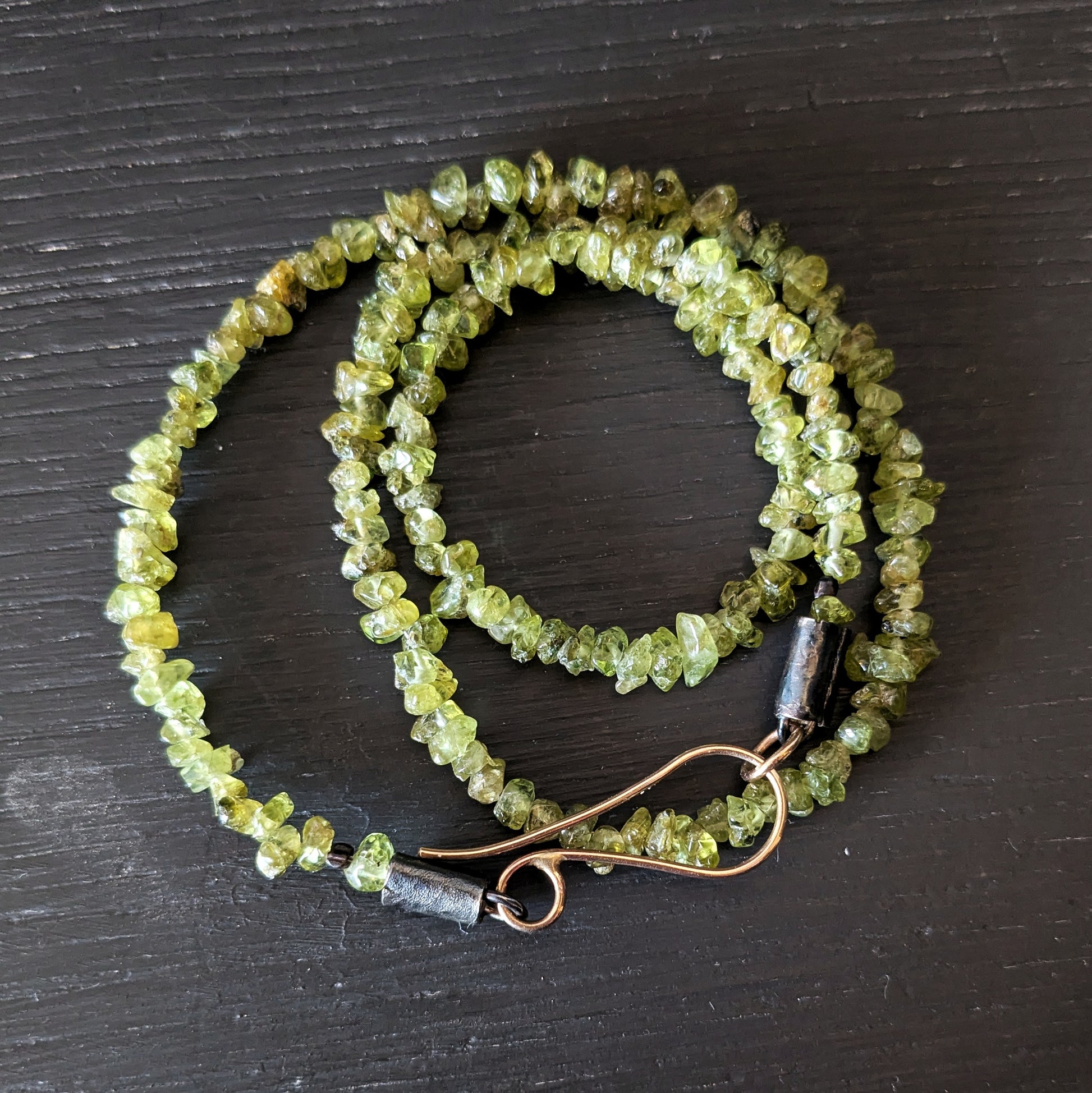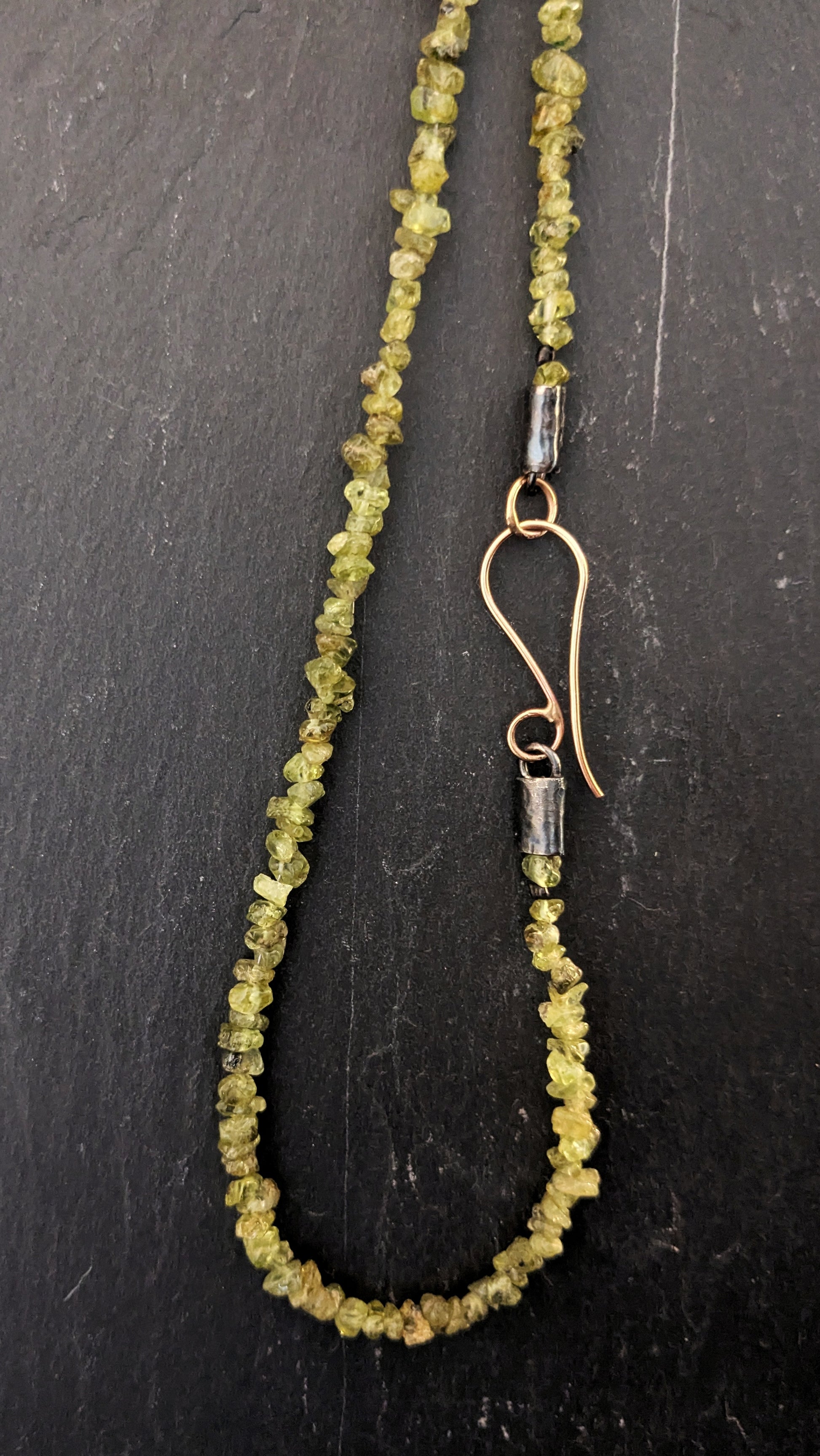 Smuk, forårsgrøn halskæde af Peridot chips, afsluttet med oxyderede sølvendestykker og en håndsmedet guldlås med matchende øskner.