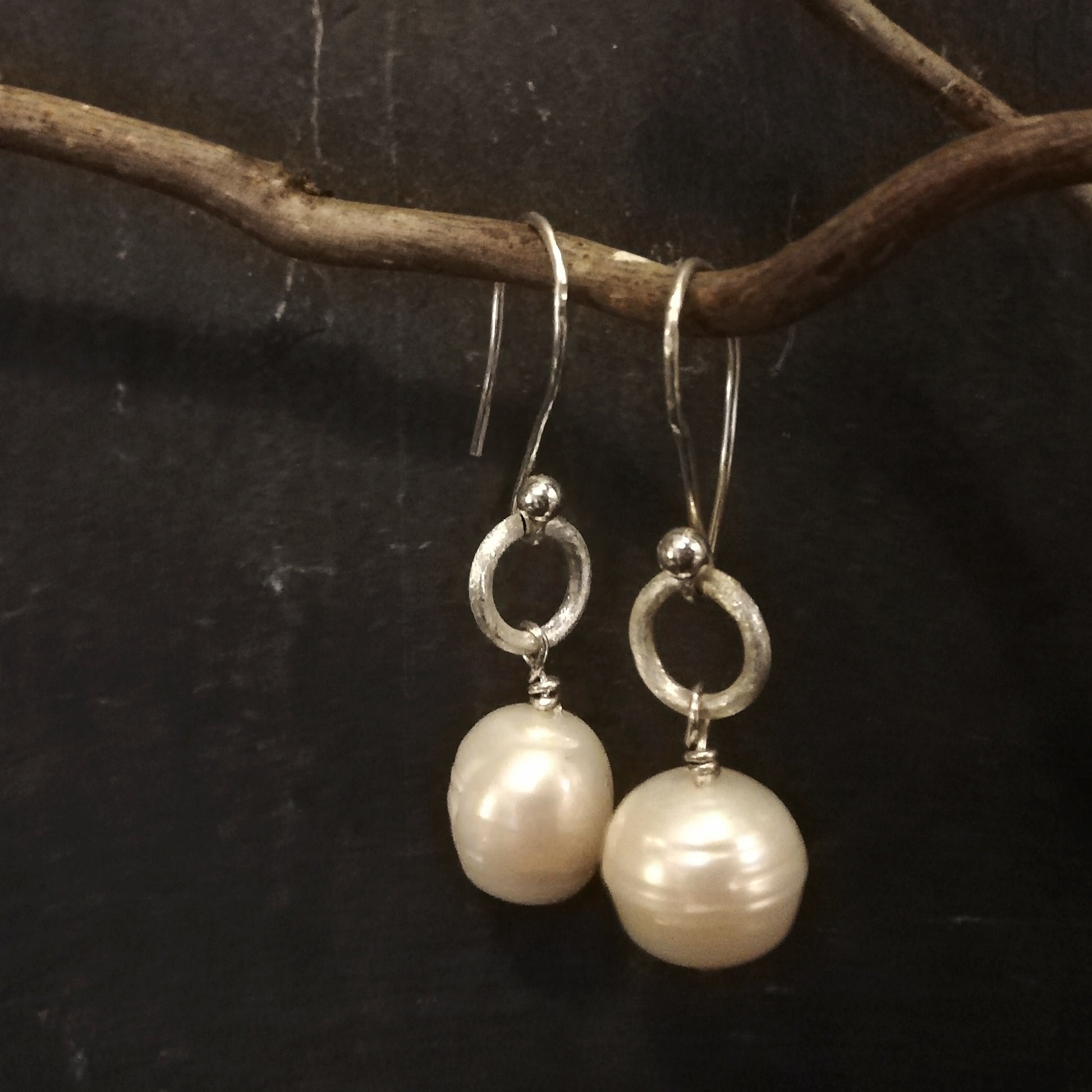 Smukke ørekroge med runde ferskvandsperler, hvor de naturlige riller i perlerne skaber et levende og organisk udtryk. Et elegant og unikt design, der fremhæver perlernes naturlige karakter.