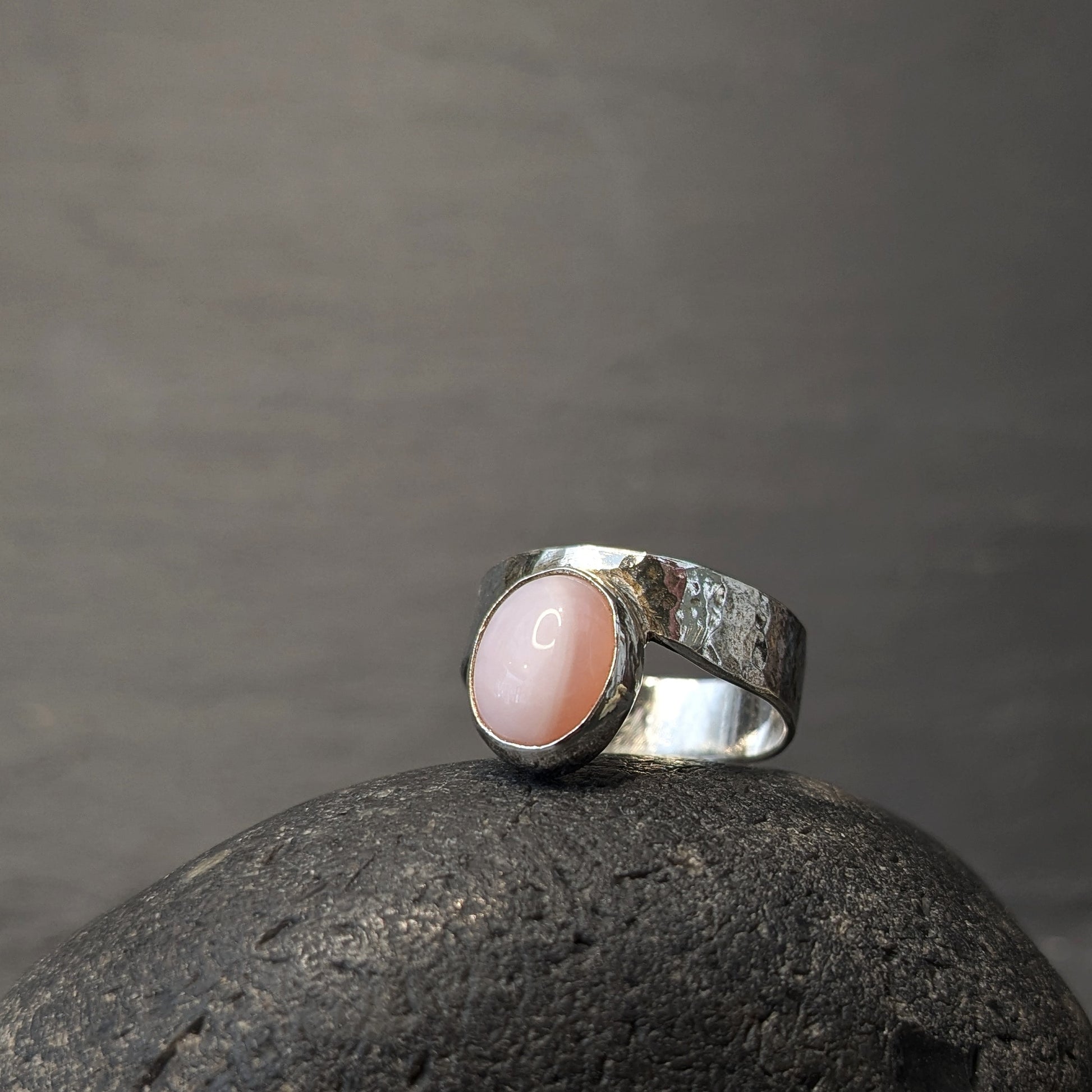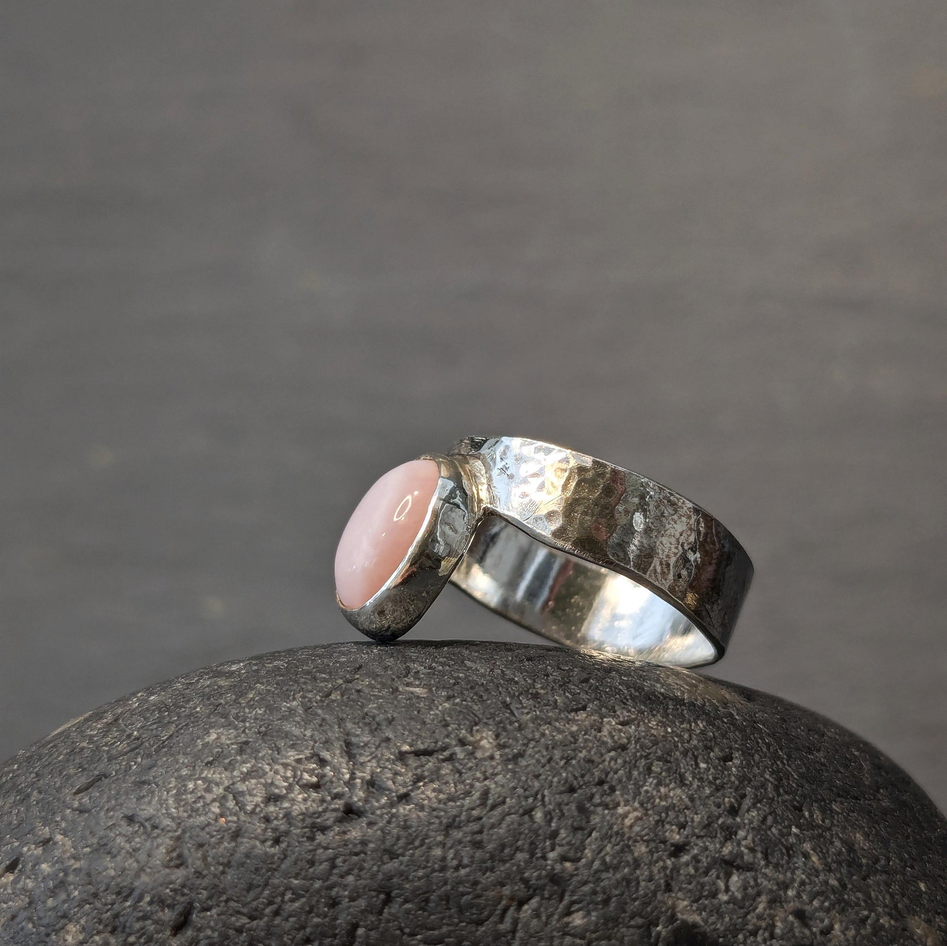 Den smukke lyserøde Pink Opal er sat asymmetrisk på kanten af ringen, så stenen får lov at stå frem med sit bløde, naturlige skær.