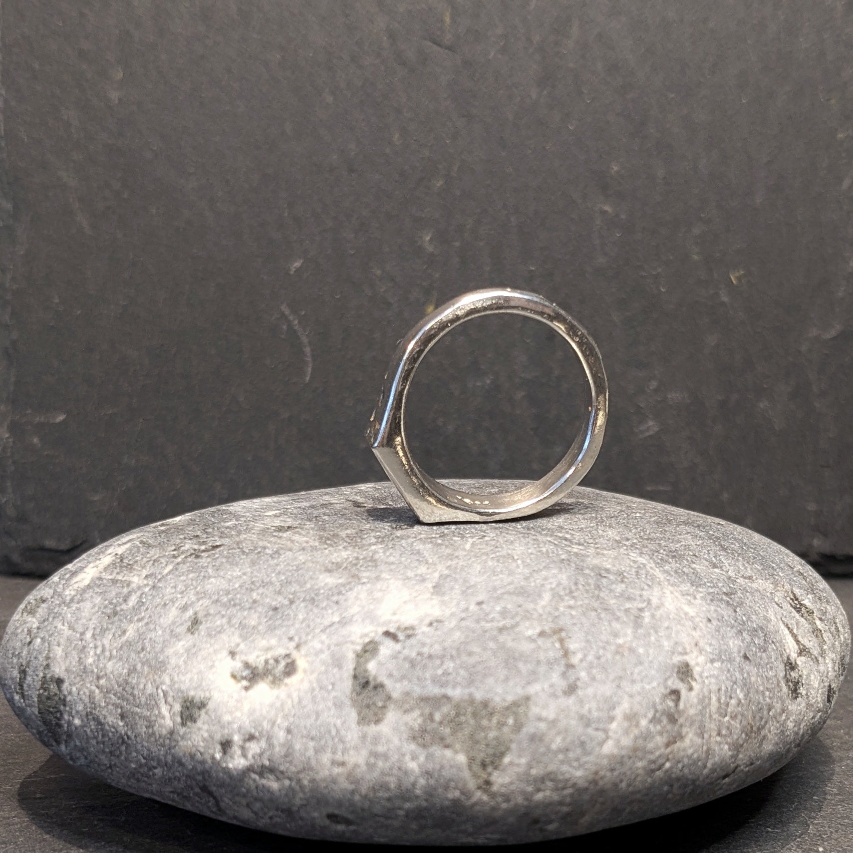 En fin og minimalistisk signet ring med smal firkantet front. Langs begge sider af fronten løber små, diskrete fordybninger, som giver ringen et elegant og håndlavet udtryk.