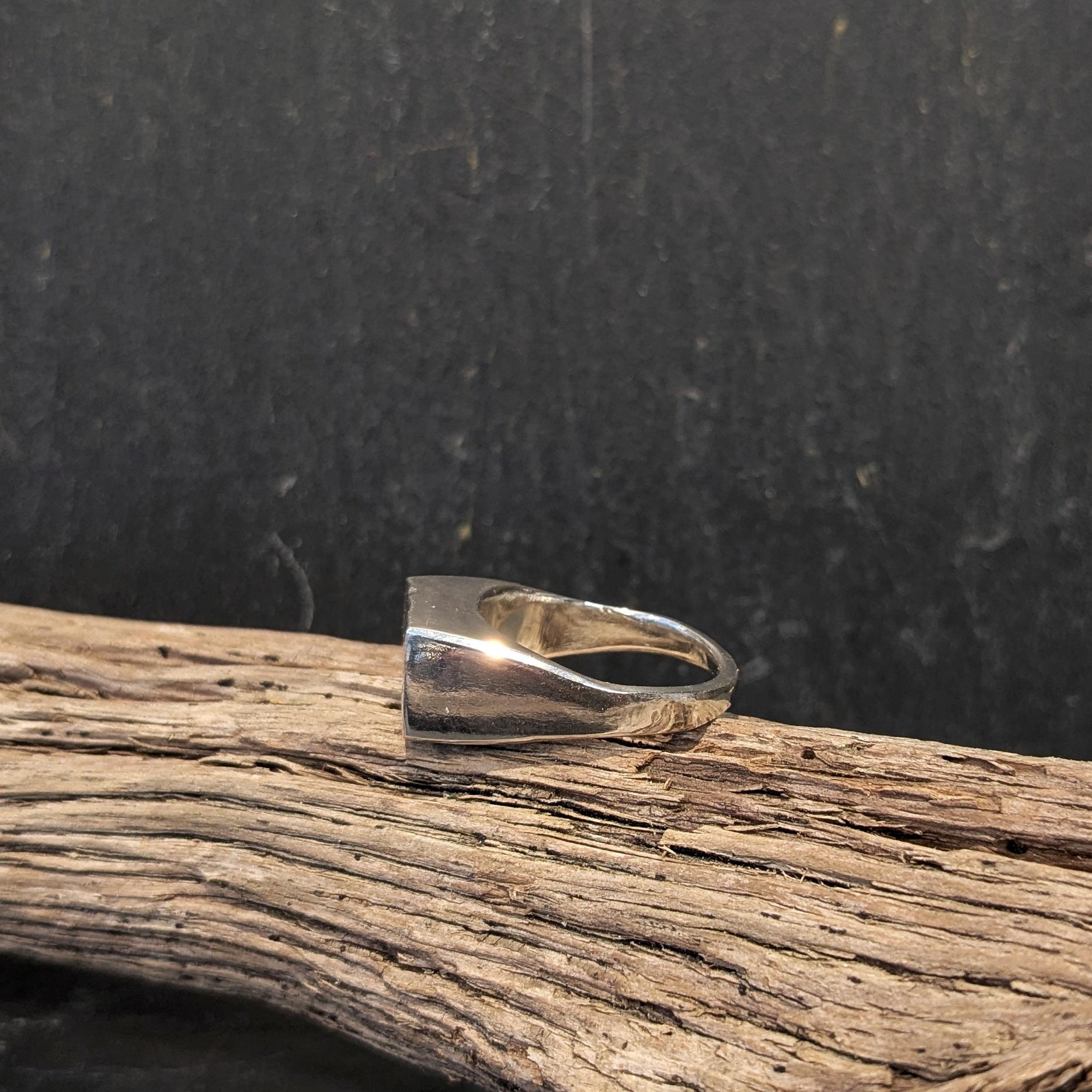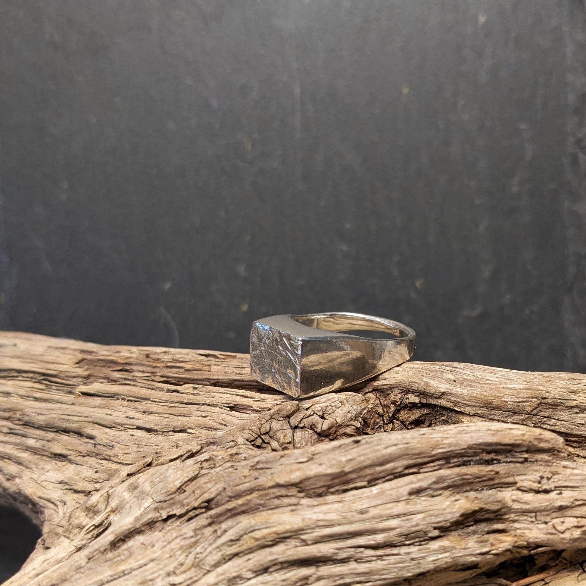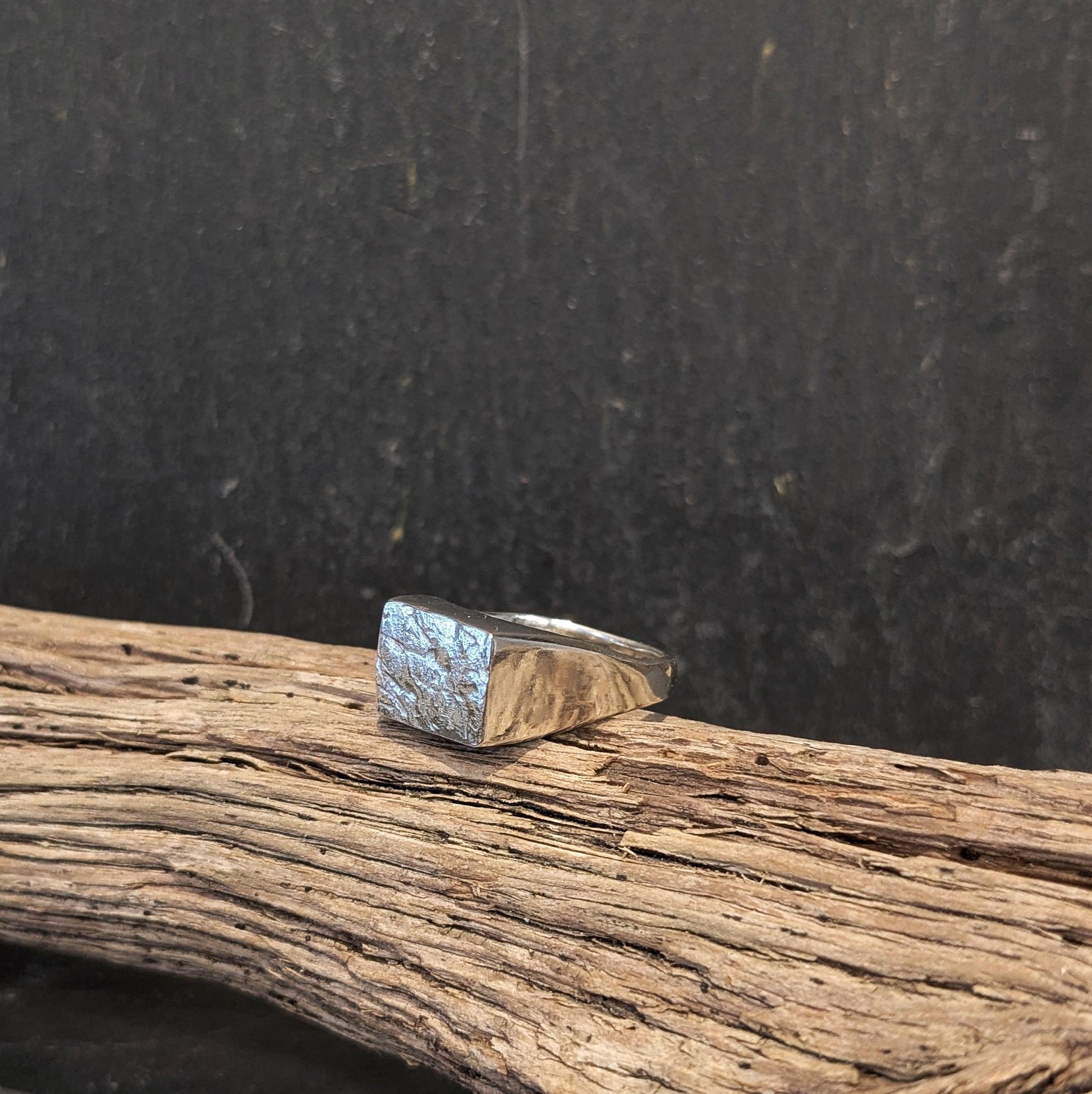 En karakterfuld og anderledes signet ring med en høj, firkantet front prydet af et råt og rustikt mønster. Et markant statement med kant og attitude.