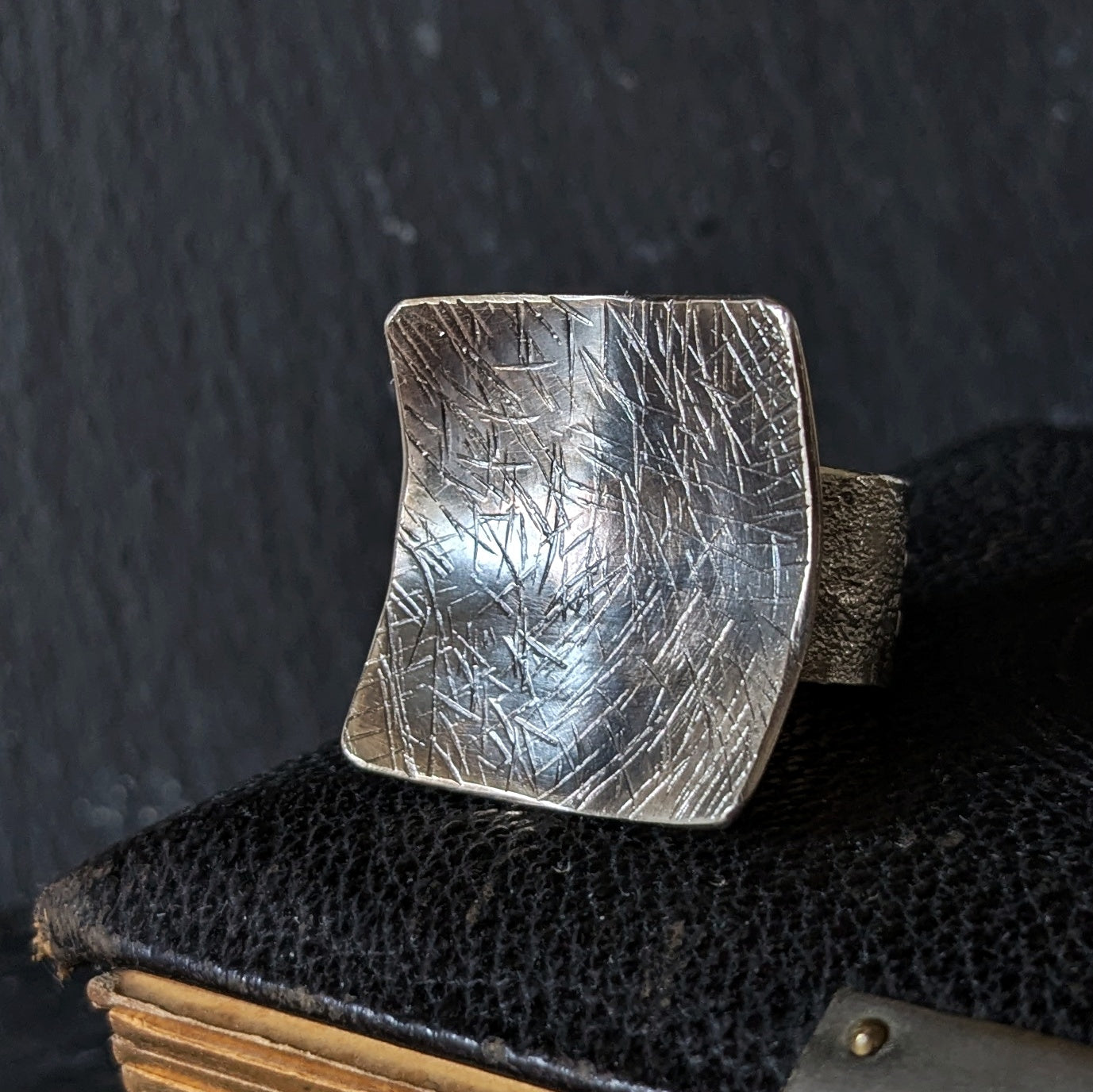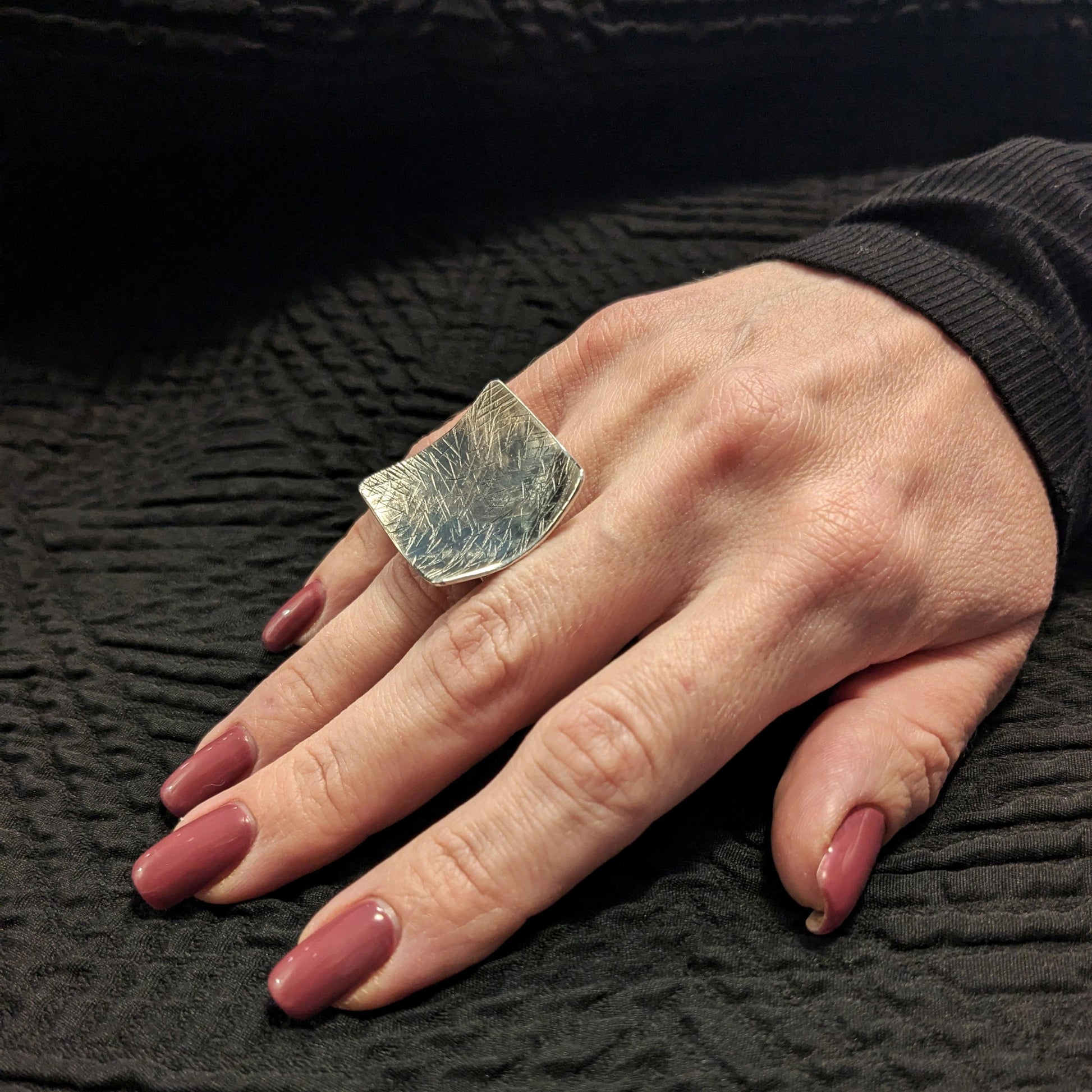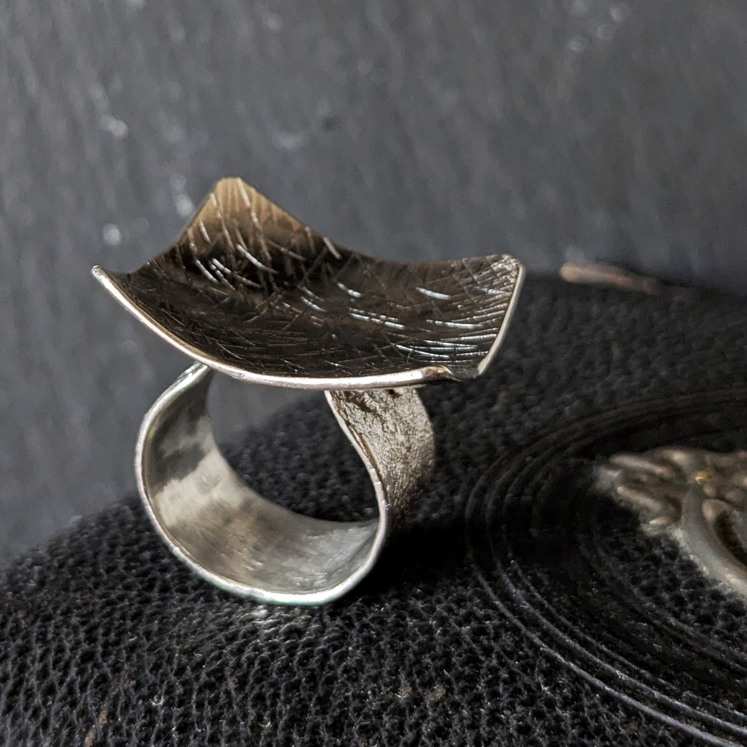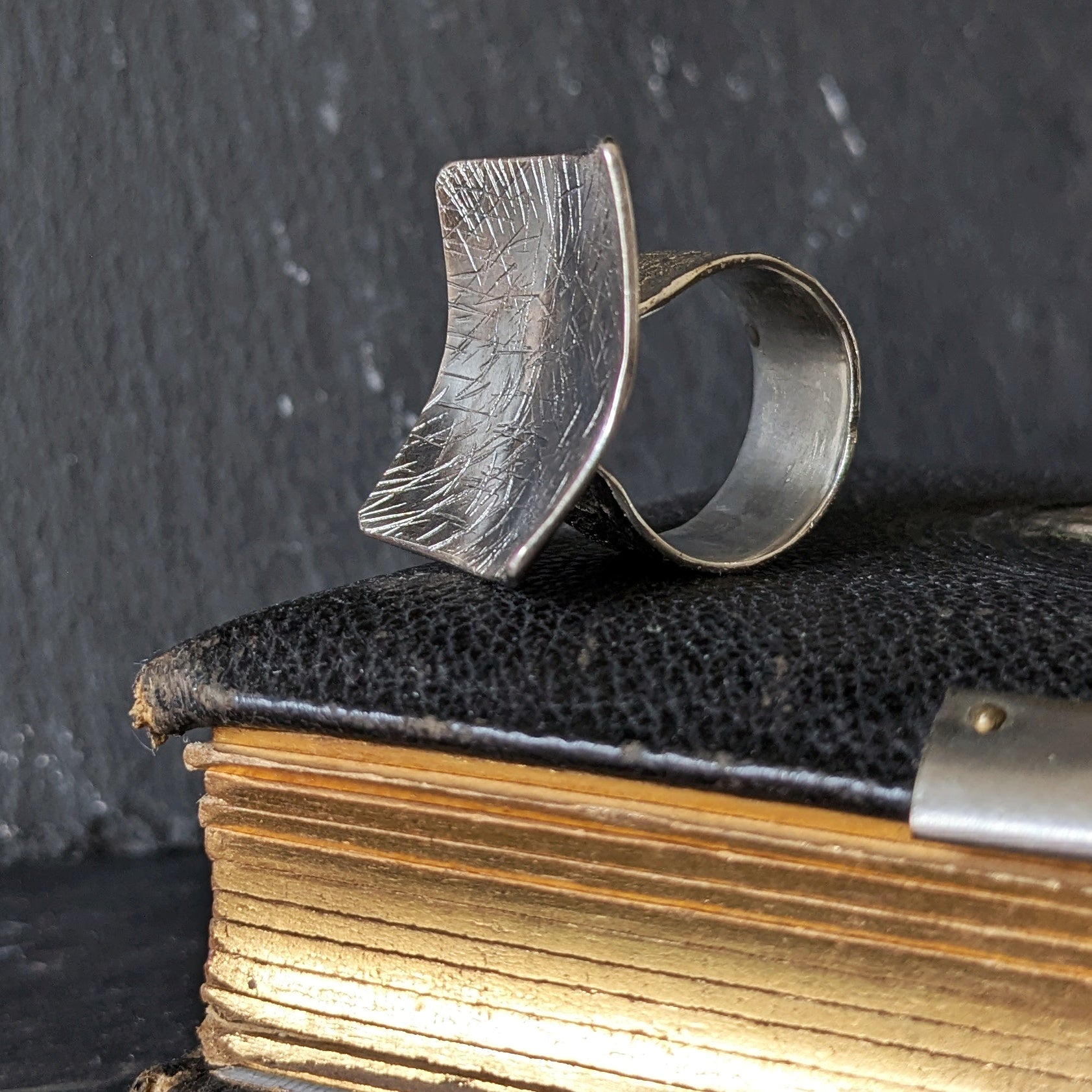 Siluet er en stor, håndlavet sølvring med grafisk kurve og rå tekstur. Formen balancerer mellem skulptur og struktur – et markant statement med blød kant.
