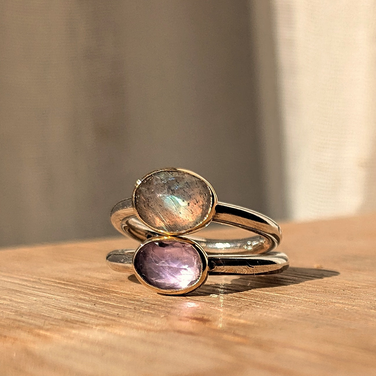 Håndlavet kraftig sølvring med en slebet labradorit med sorte nister, svøbt i en guldfatning – et råt og elegant statement.