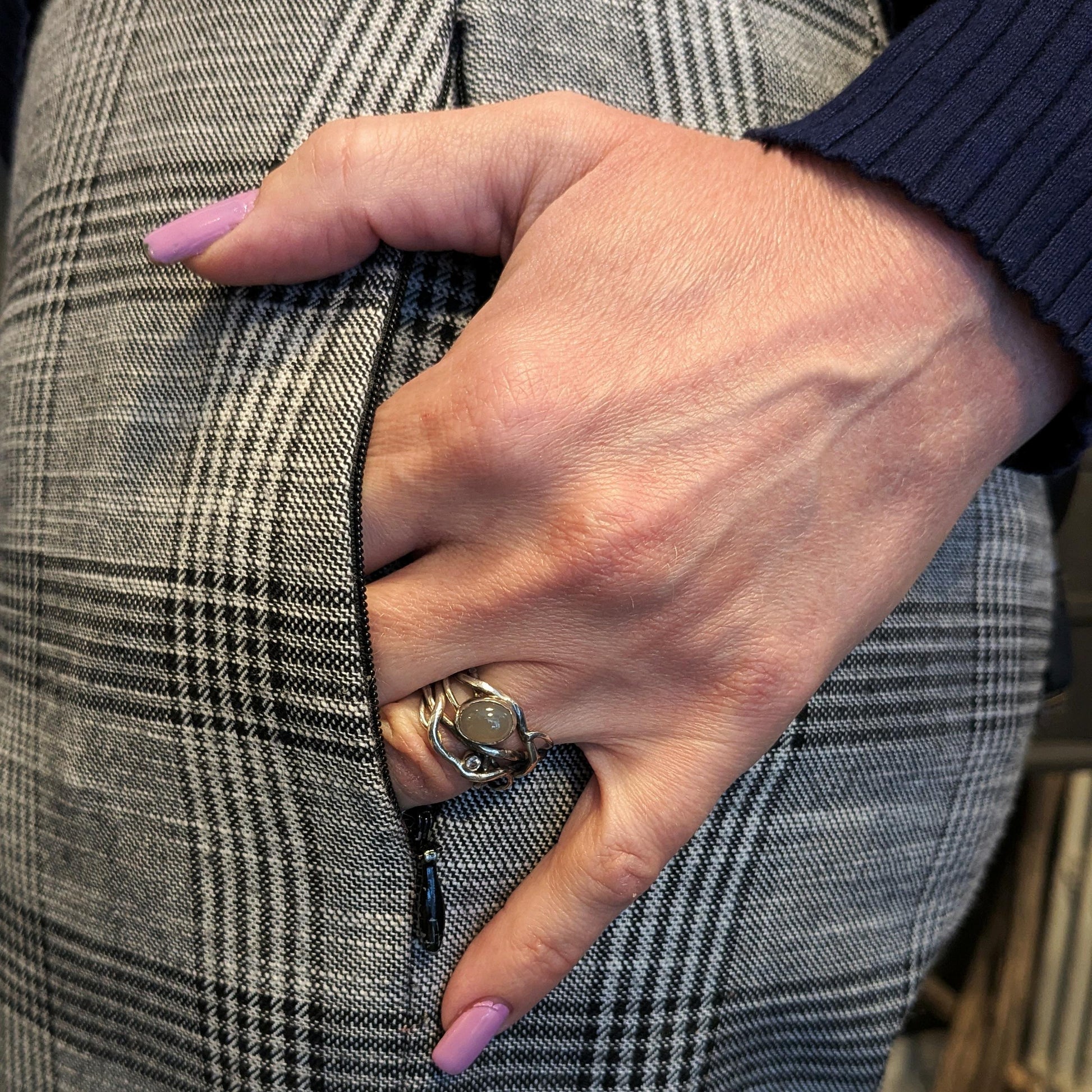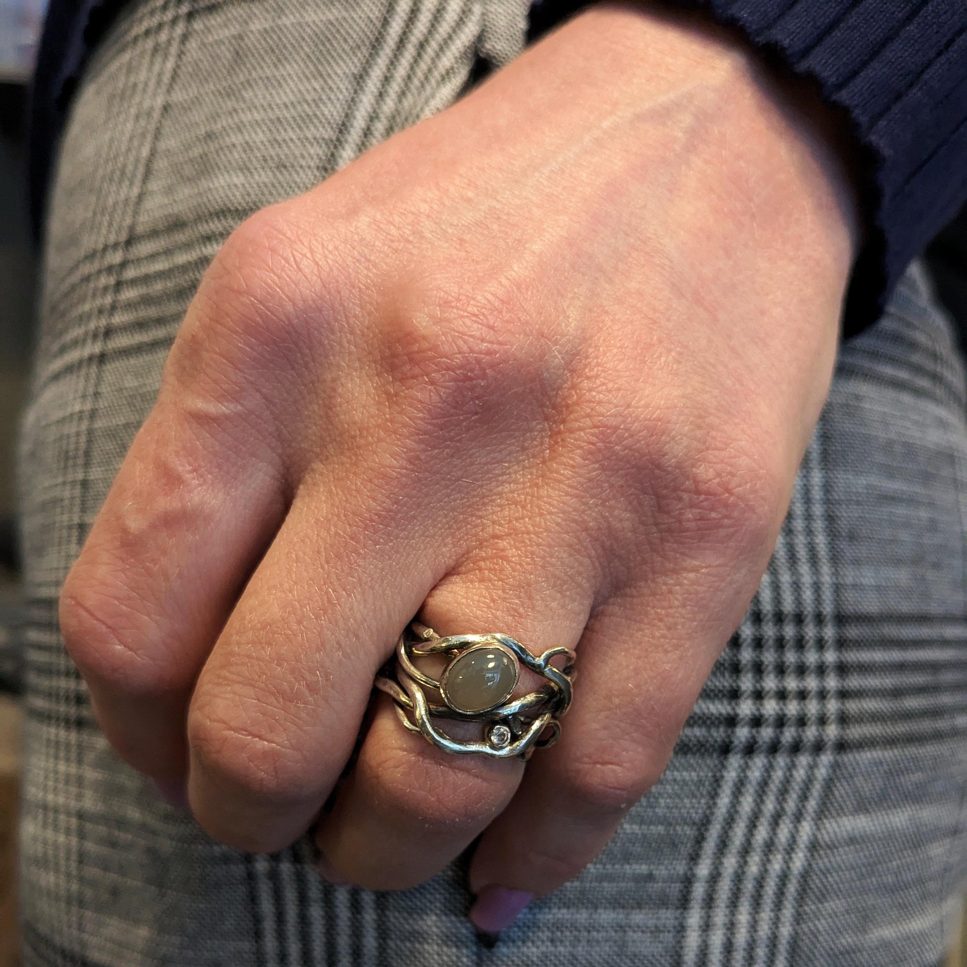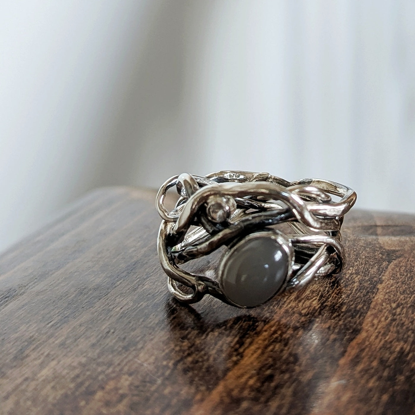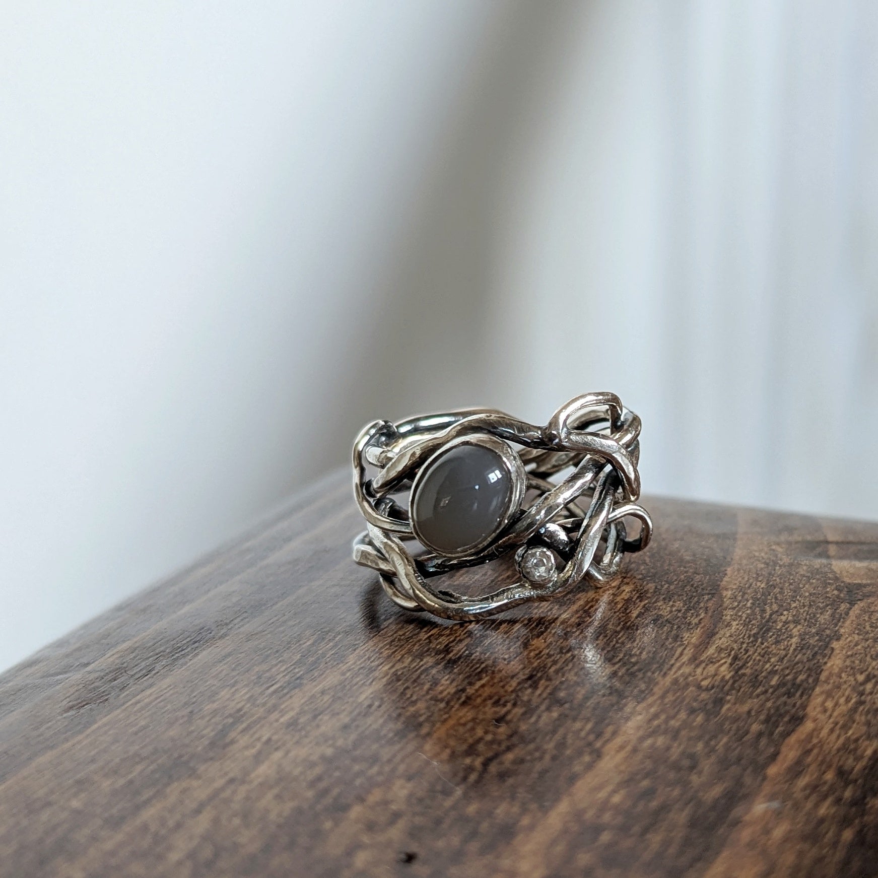 Håndlavet Woven ring i sterlingsølv med grå-brun månesten og et glimtende morganit.